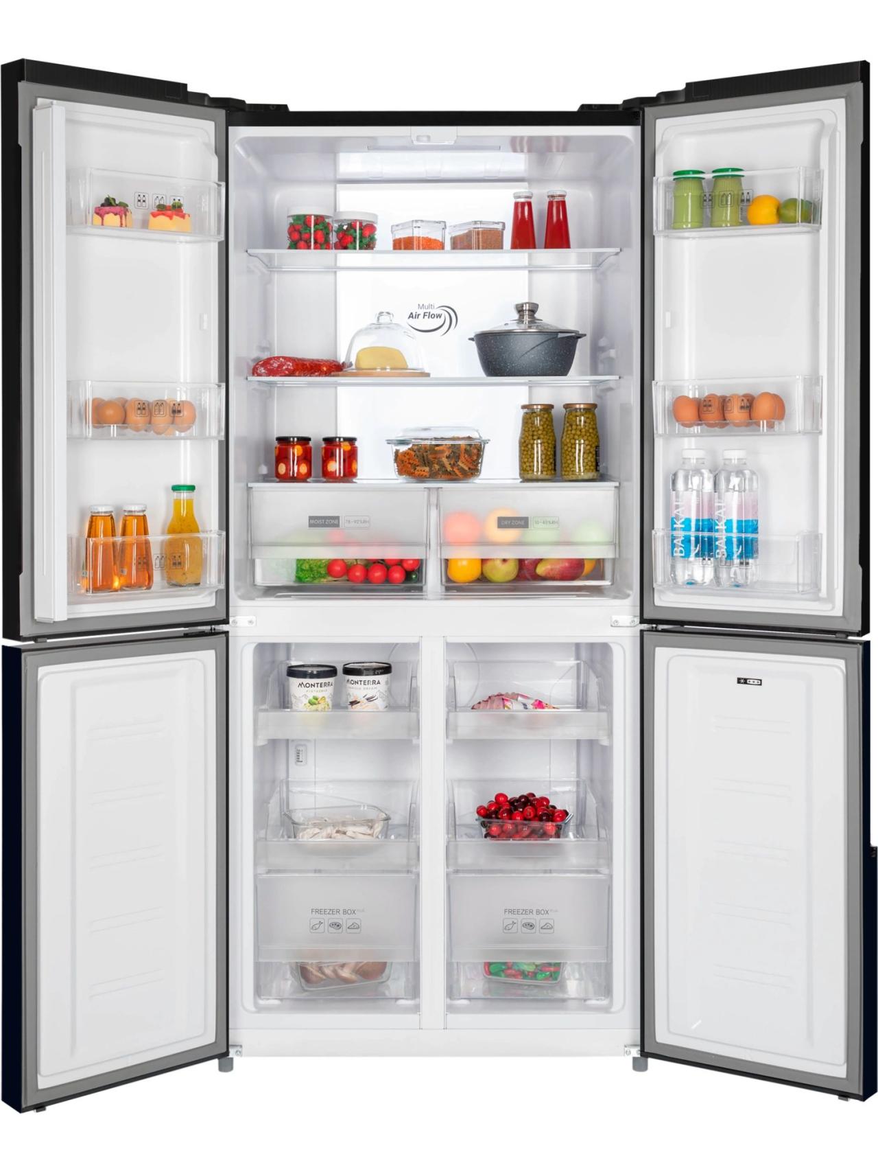 4-х дверный холодильник имеет единое пространство верхних полок холодильной камеры, чтобы удобно было размещать габаритные кастрюли и контейнеры. Прочные полки из закаленного стекла можно регулировать по высоте, а ящики в холодильной камере предназначены для хранения овощей и фруктов и оснащены влажной зоной свежести и сухой.