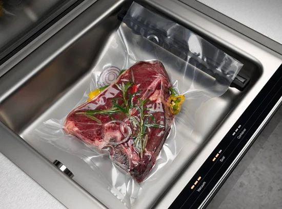 С помощью вакууматора Миле EVS 7010 BRWS можно делить на порции, если нельзя сохранить продукты полностью, упаковывать, мариновать, а также подготавливать, овощи, мясо и рыбу к готовке в режиме Sous-vidе. Полный объем внутренней камеры - 8 литров, что обеспечивает сохранение даже больших пакетов с едой. Устройство открывается без ручки по современной технологии Push2open, нужно просто нажать на внешнюю панель и ящик откроется. Прибор управляется с помощью сенсорных кнопок и символьных надписей на панели управления. Степеней вакуумирования всего 3. О достижении каждой из них предупредит светодиодная индикация. Также, она подскажет и о том, что надо удалить воду из насоса. Предусмотрена индикация продолжительности запаивания упаковки. Техника сконструирована с учетом потребностей покупателя. Все рассчитано нато, чтобы положить пакет в вакууматор, нажать нужную кнопку и достать пакет через некоторое время.