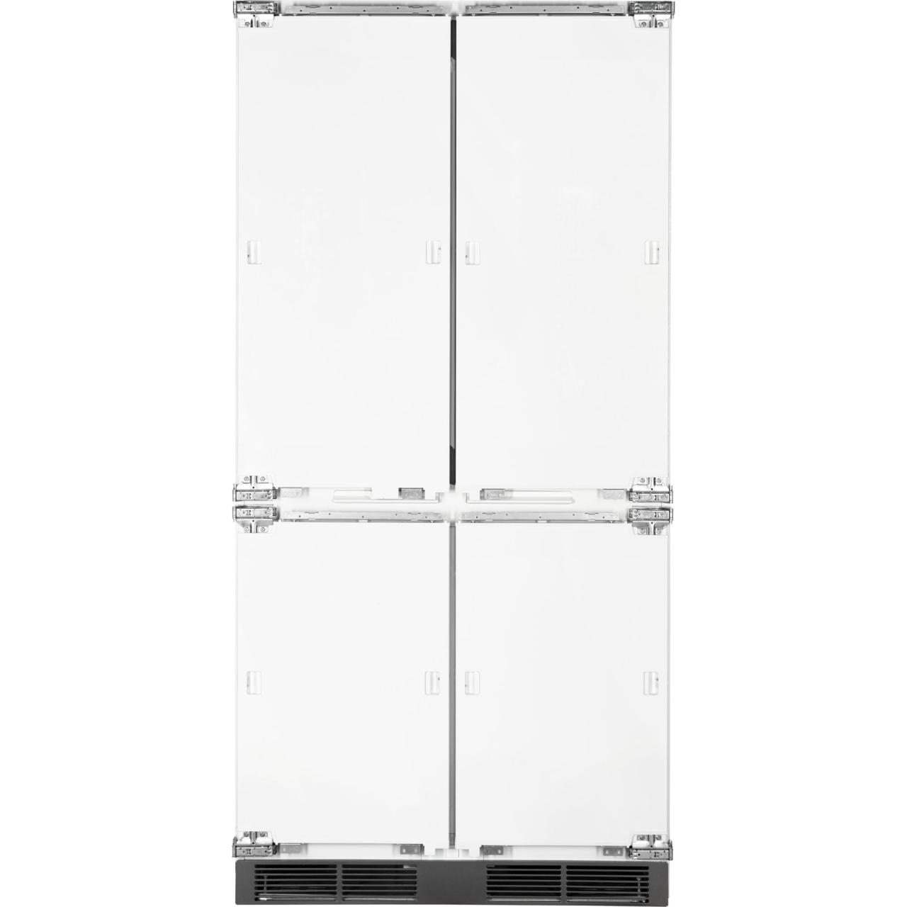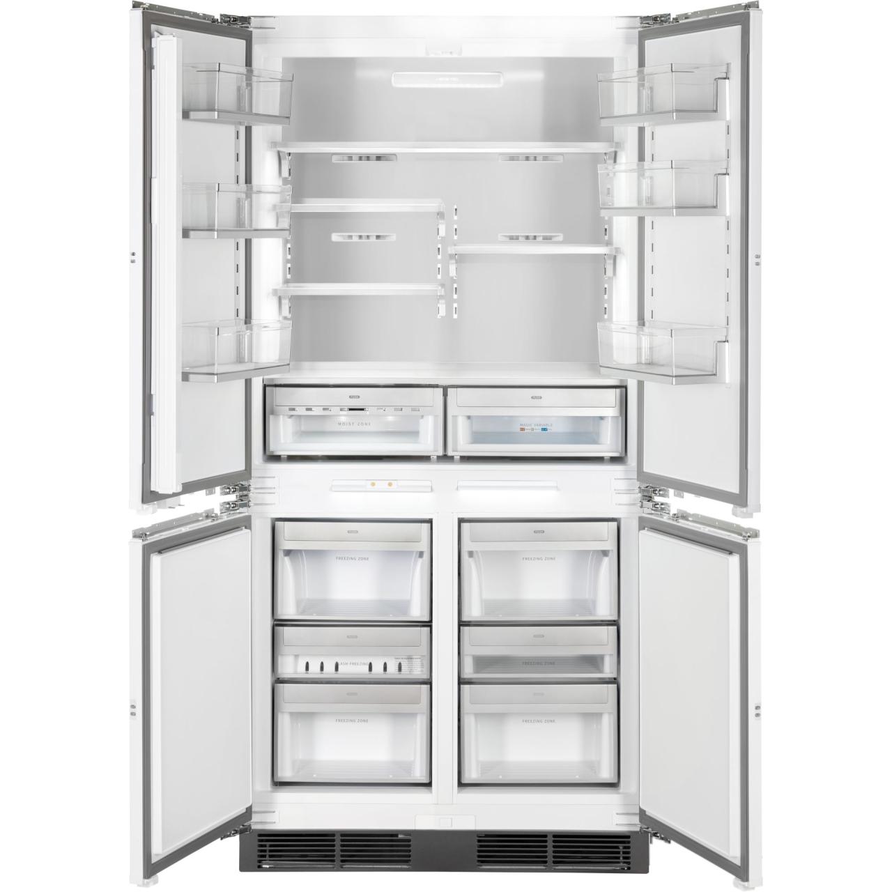 Благодаря четырехдверной конструкции и открыванию дверь в дверь пользователь получает доступ к продуктам, не выпуская при этом холод из остальной части холодильника. Модель имеет жесткую систему крепления фасадов: они не связаны с корпусом шкафа, не предполагают наличие дополнительных петель. Холодильник имеет неограниченный угол открывания, отсутствуют зазоры, в которых могут скапливаться загрязнения.